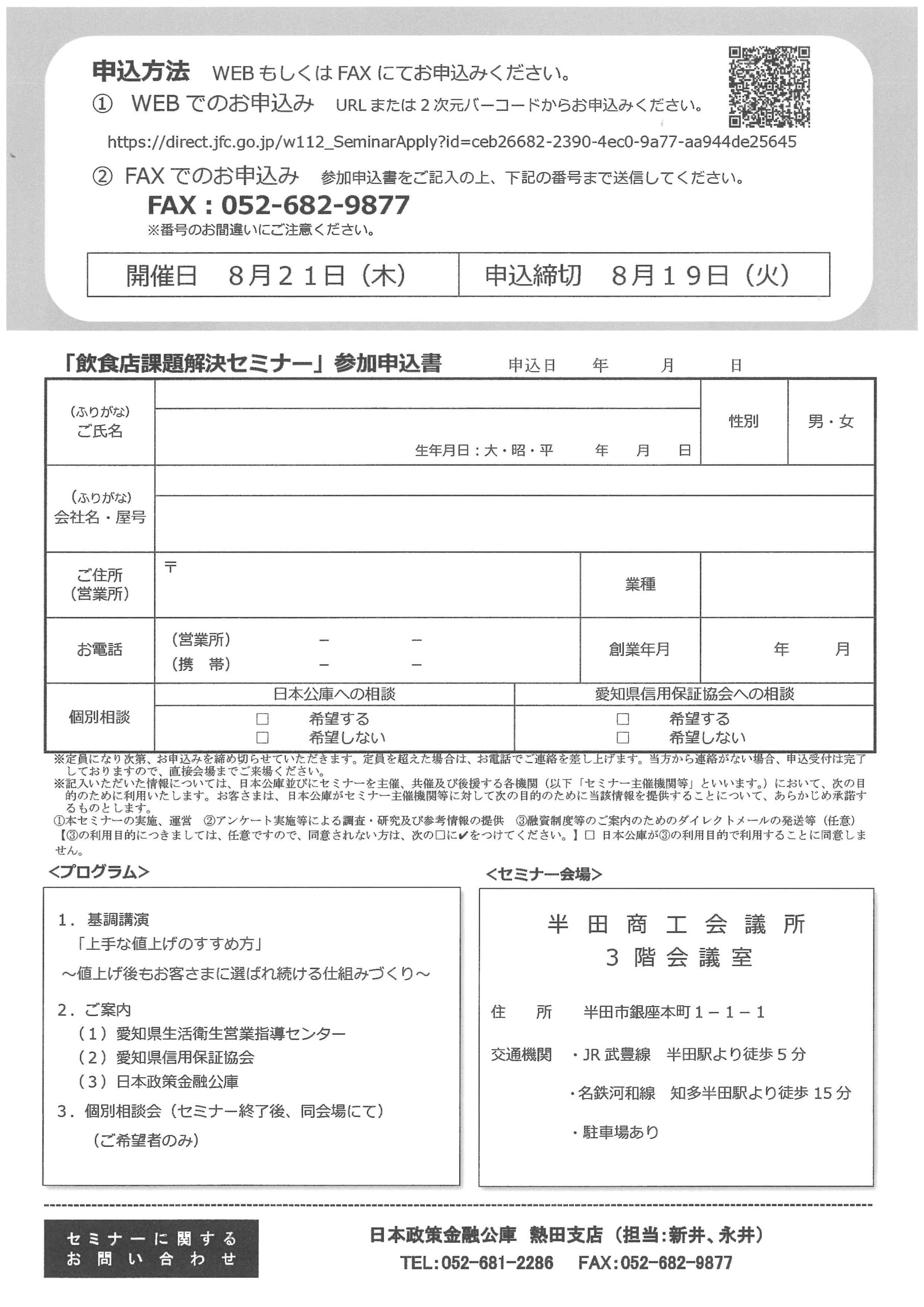 『飲食店課題解決セミナー』の開催について(日本政策金融公庫)<終了しました>